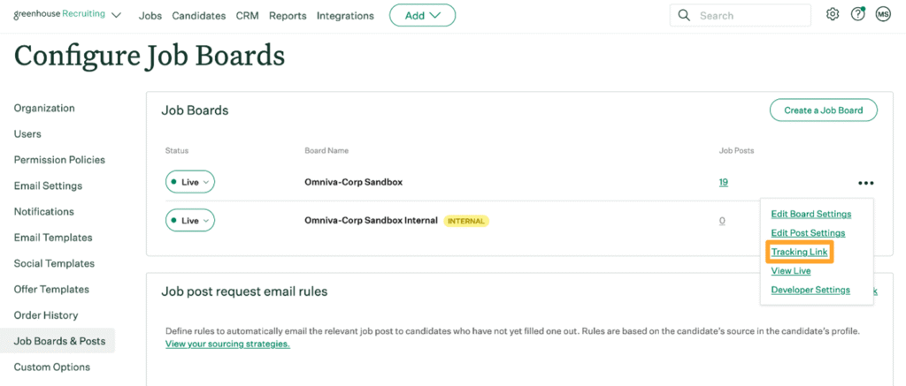 in the upper right-hand corner. - Then, select “Job Boards & Posts” from the left-hand panel.